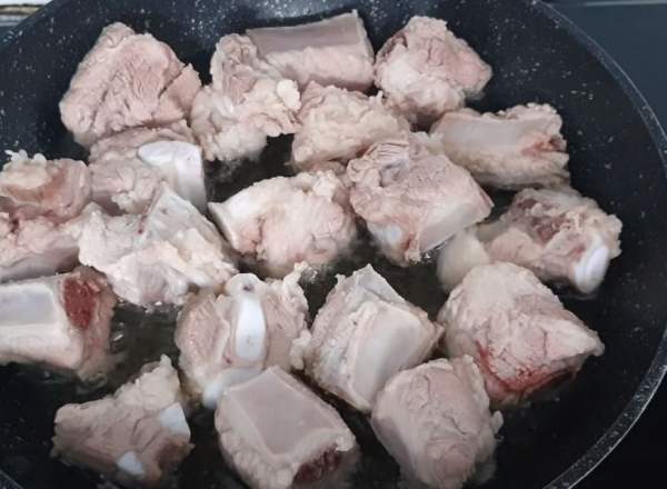 Bắc chảo lên bếp, cho mọt chút dầu ăn vào và đun nóng. Lần lượt xếp các miếng sườn vào chảo và rán vàng đều các mặt.