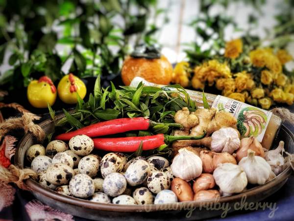 - Rau răm rửa sạch,gừng thái chỉ,tỏi hành tỏi bóc vỏ băm nhỏ. Trứng cút bóc vỏ để riêng.