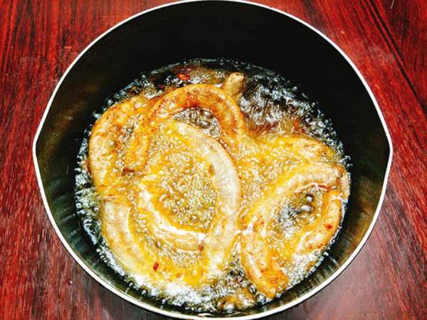 Đặt chảo lên bếp, cho nhiều dầu. Khi dầu nóng thì bỏ lòng vào chiên tới khi chín. Miếng lòng có màu hơi vàng là có thể vớt ra để ráo dầu.