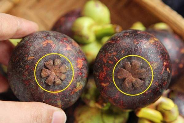 Phần đáy của quả măng cụt có một phần trông như bông hoa. Nếu để ý kỹ, bạn sẽ thấy "bông hoa" ở mỗi quả có số lượng cánh không giống nhau. Những cánh hoa này tương ứng với số múi bên trong quả. Nếu bạn muốn ăn những quả hạt bé thì nên chọn quả nhiều cánh. Những quả ít cánh hạt sẽ to.