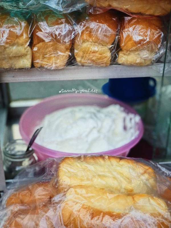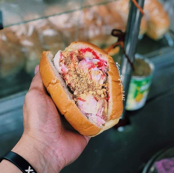 Bánh mì kẹp kem là một món ăn gắn liền với tuổi thơ vì hương vị đặc biệt khó mà cưỡng lại. Kem được kẹp giữa bánh mì làm nhân, thêm sữa đặc và rắc kèm ít đậu phộng rang. Cách làm mặc dù rất đơn giản nhưng lại cực kì gây nghiện nhờ miếng bánh mì mềm kèm với vị mát lạnh của kem trong miệng. Với thời tiết nắng nóng của TP.HCM ở hiện tại thì thưởng thức một chiếc bánh mì kẹp kem lạnh mát là rất lý tưởng.