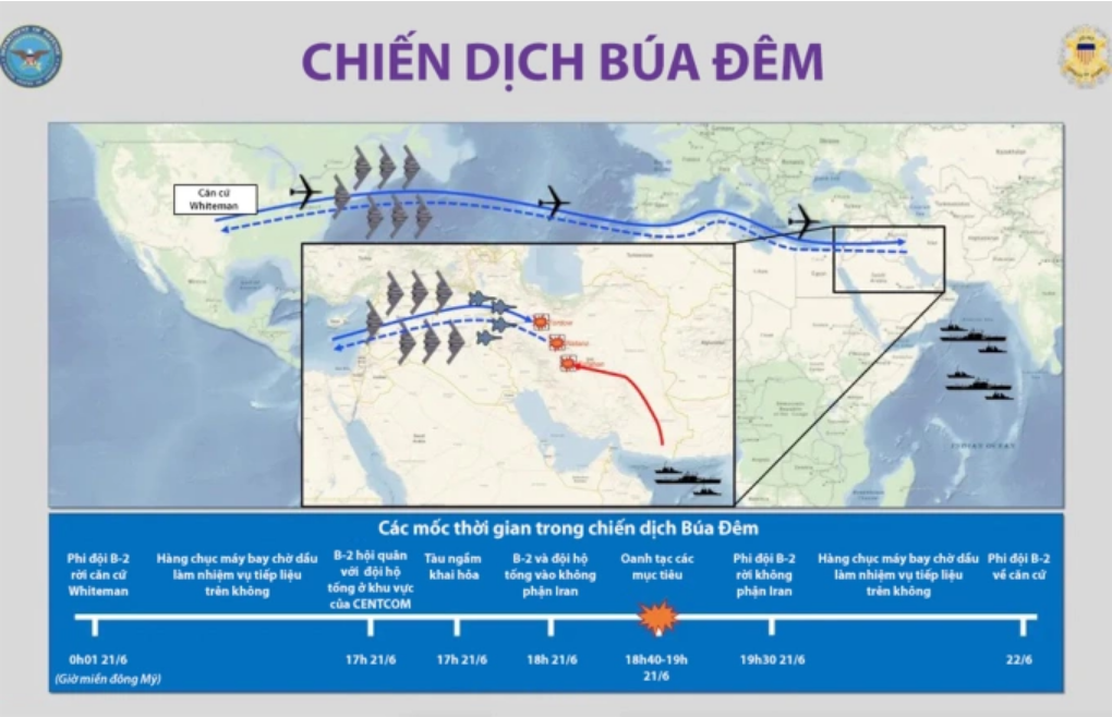 Tại cuộc họp báo ở Lầu Năm Góc ngày 22/6, Chủ tịch Hội đồng tham mưu trưởng Liên quân Mỹ Dan Caine cho biết cuộc không kích nhằm vào các cơ sở hạt nhân Iran mang tên "Chiến dịch Búa Đêm". Mỹ đã sử dụng 14 quả bom xuyên phá hầm GBU-57 khối lượng 14 tấn, hơn 20 tên lửa Tomahawk và hơn 125 máy bay quân sự trong chiến dịch tấn công Fordow, Natanz và Isfahan. Nhóm 7 oanh tạc cơ B-2 đóng vai trò chính, yểm trợ chúng là các tiêm kích, máy bay tiếp liệu, phi cơ trinh sát...
