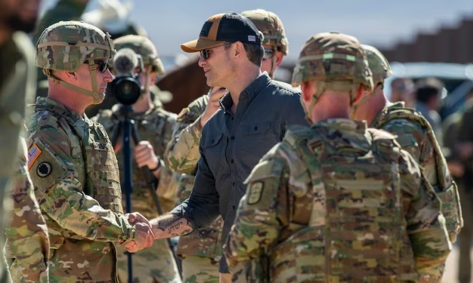 Bộ trưởng Quốc phòng Mỹ Pete Hegseth (đội mũ lưỡi trai) bắt tay các binh sĩ ở khu vực biên giới Mỹ - Mexico ngày 3/2. Ảnh: AP