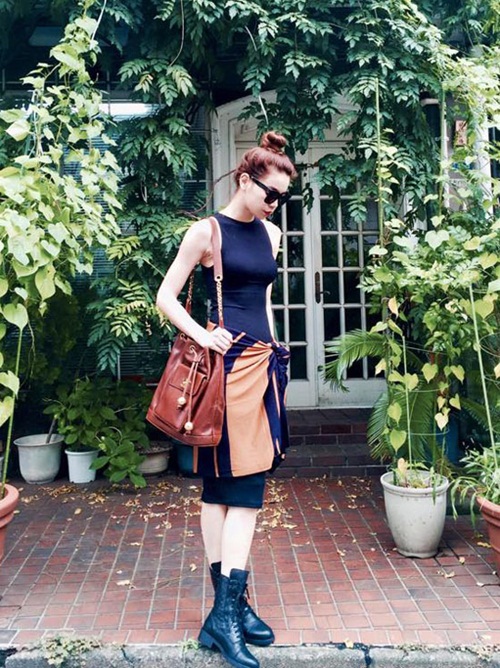 Tăng Thanh Hà chuộng mốt denim với áo váy freesize, sandals buộc dây theo trào lưu hot của Thu Đông năm nay. Thích hợp mặc trong mọi tiết trời nên chất liệu denim là sự lựa chọn của nhiều tín đồ thời trang.