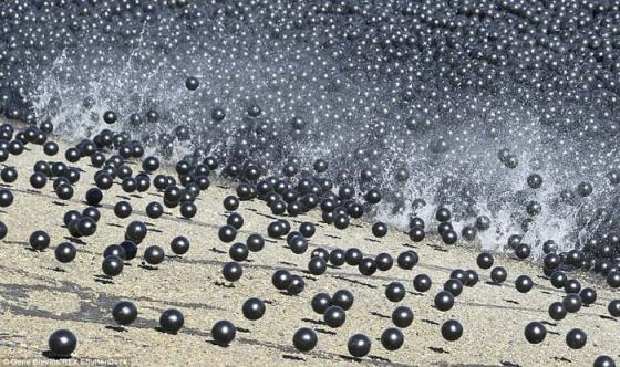 Những quả bóng nhựa màu đen này được thả xuống hồ chứa nhằm bảo vệ nước trong hồ khỏi bụi, hóa chất, các loài động vật hoang dã cũng như để ngăn chặn hơn 1 tỷ lít nước bốc hơi khỏi hồ chứa mỗi năm.