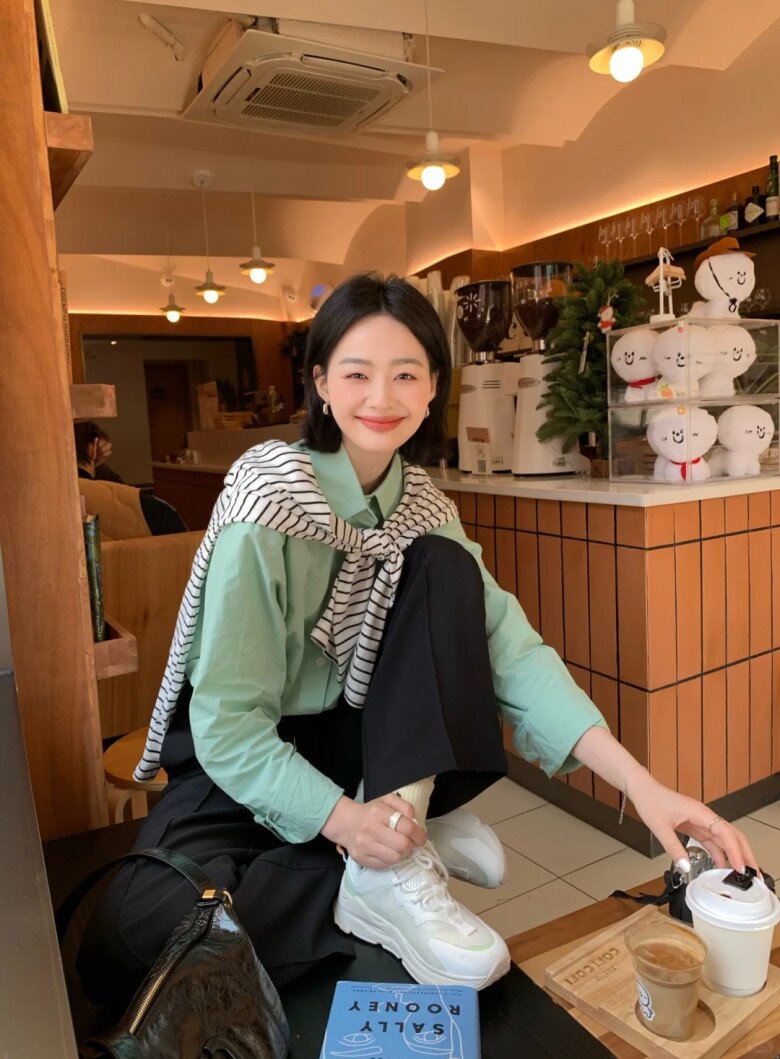 Một chiếc áo sơ mi xanh bạc hà kết hợp với quần trắng hoặc váy midi sáng màu sẽ tạo nên vẻ ngoài vừa thanh lịch, vừa nổi bật. Đây là cách để bạn giữ được nét hiện đại mà không làm mất đi không khí Tết.