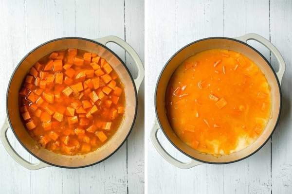 - Đun sôi sau đó giảm lửa và để như vậy trong 15-20 phút đến khi khoai lang mềm.