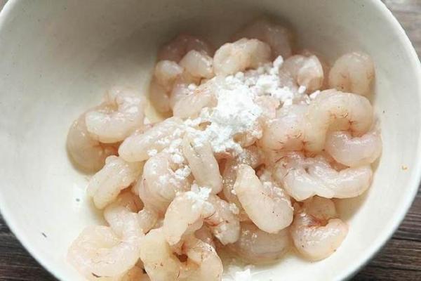 Tôm bóc vỏ, bỏ chỉ, rửa sạch, để ráo rồi cho vào bát. Thêm xíu muối, trộn đều. Sau đó thêm 1 thìa rượu nấu ăn, 1 thìa tinh bột, trộn đều rồi ướp trong vòng 10 phút để tôm ngấm gia vị.