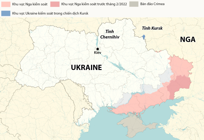 Sau gần ba năm chiến sự, quân đội Nga đang kiểm soát khoảng 20% lãnh thổ ở Ukraine, tương đương khoảng 112.000 km2. Ukraine trong khi đó kiểm soát khoảng 450 km2 ở tỉnh Kursk.