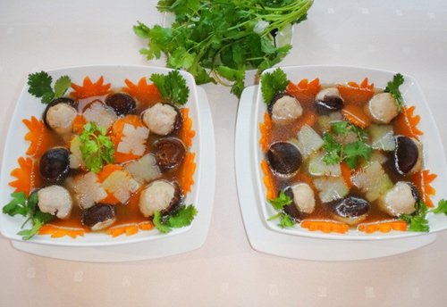 – Bạn múc rau củ ra bát tô, cho mọc lên trên sau đó rưới nước dùng vào và vậy là món canh thơm ngon của chúng ta đã hoàn thành rồi.