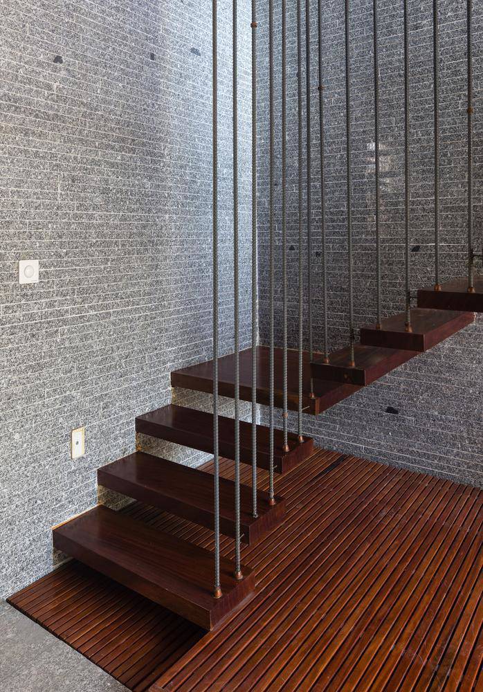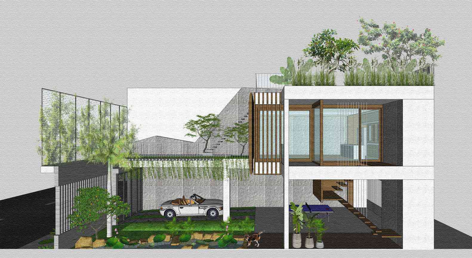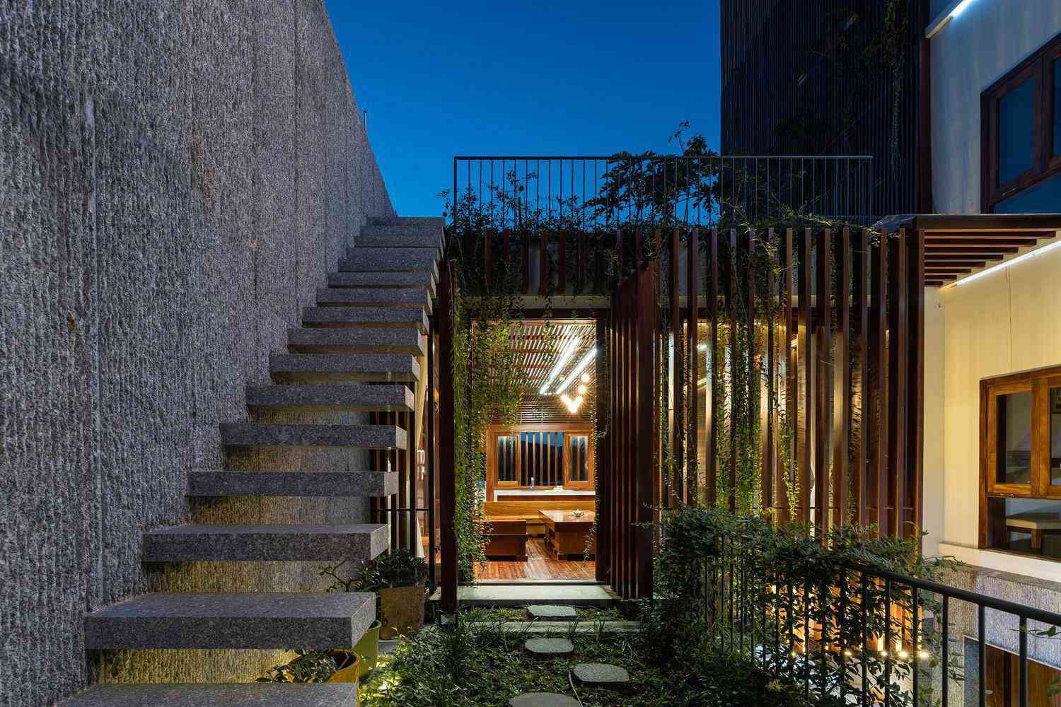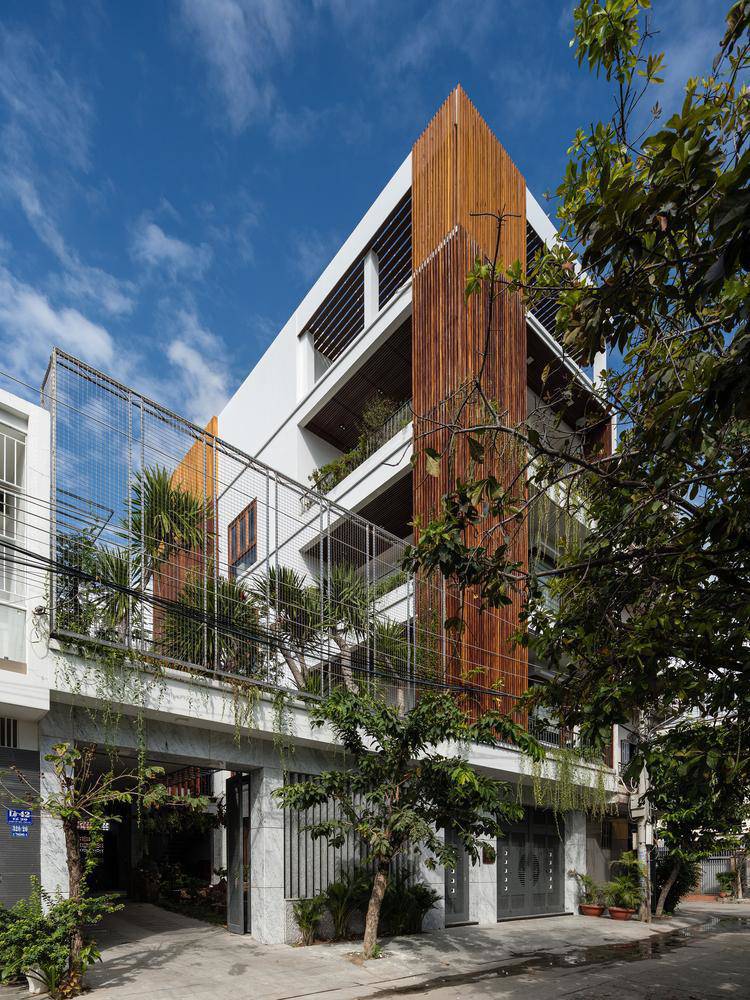 Mặt tiền là những tấm rèm xanh cùng tông màu trầm ấm của gỗ dựa trên kết cấu sẵn có được phân bổ hợp lý, vừa để giảm bức xạ nhiệt vừa mang lại bóng mát và sự thơ mộng cho ngôi nhà.