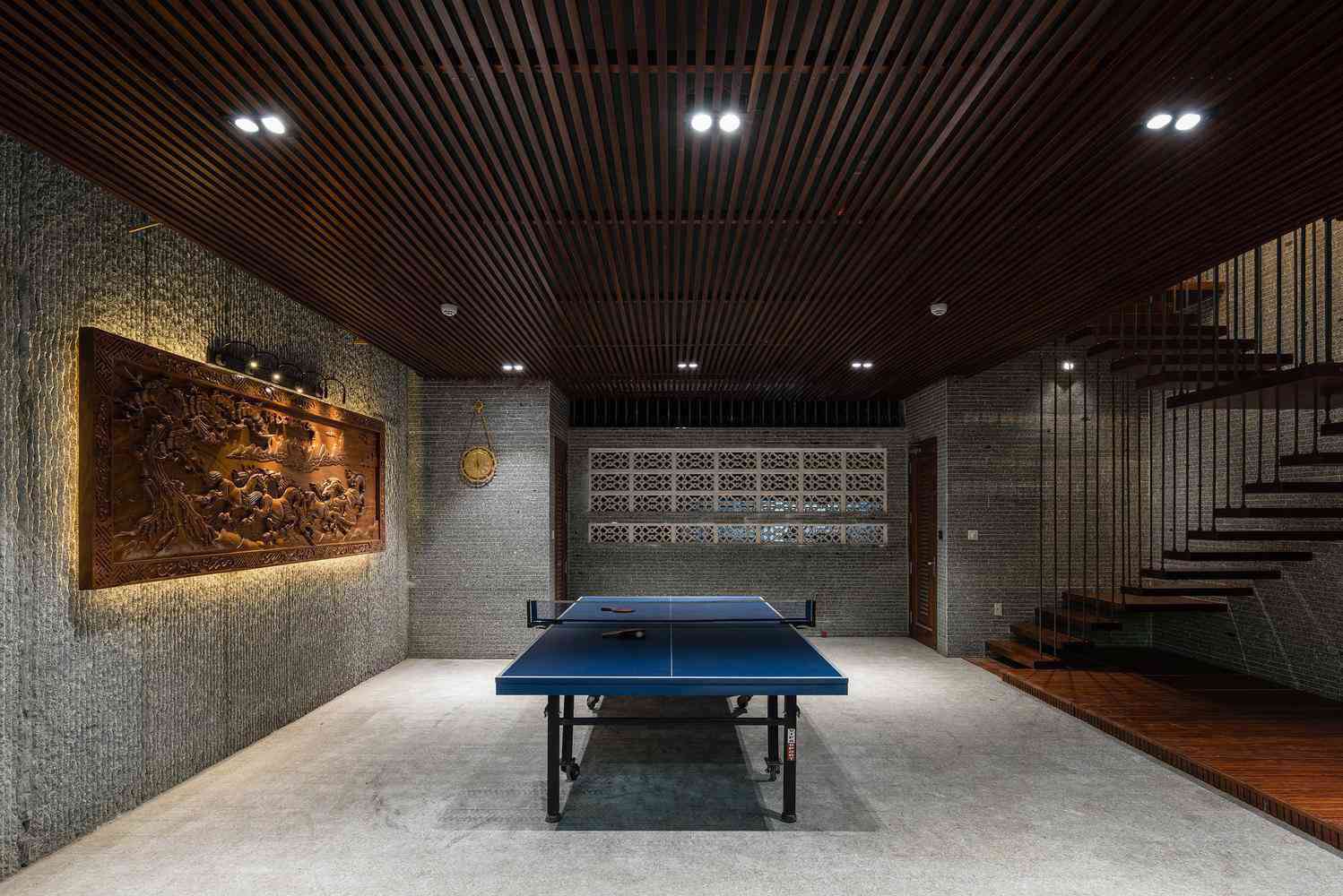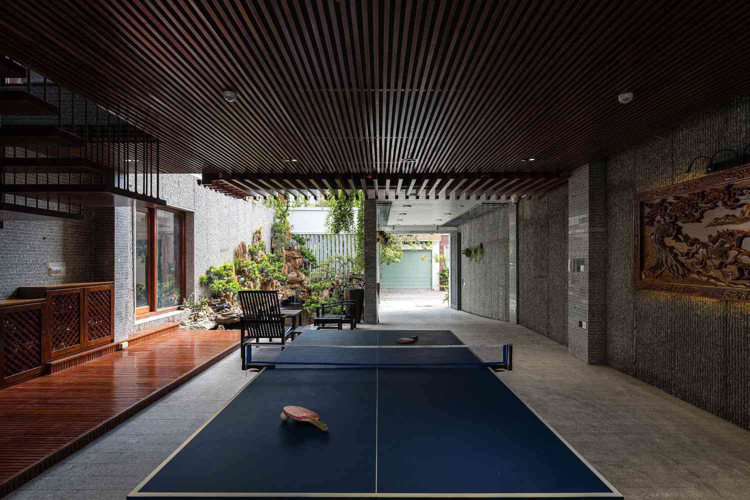 Phòng khách ở tầng 1 còn đặt một bàn đánh tennis để các thành viên trong nhà và bạn bè giải trí.
