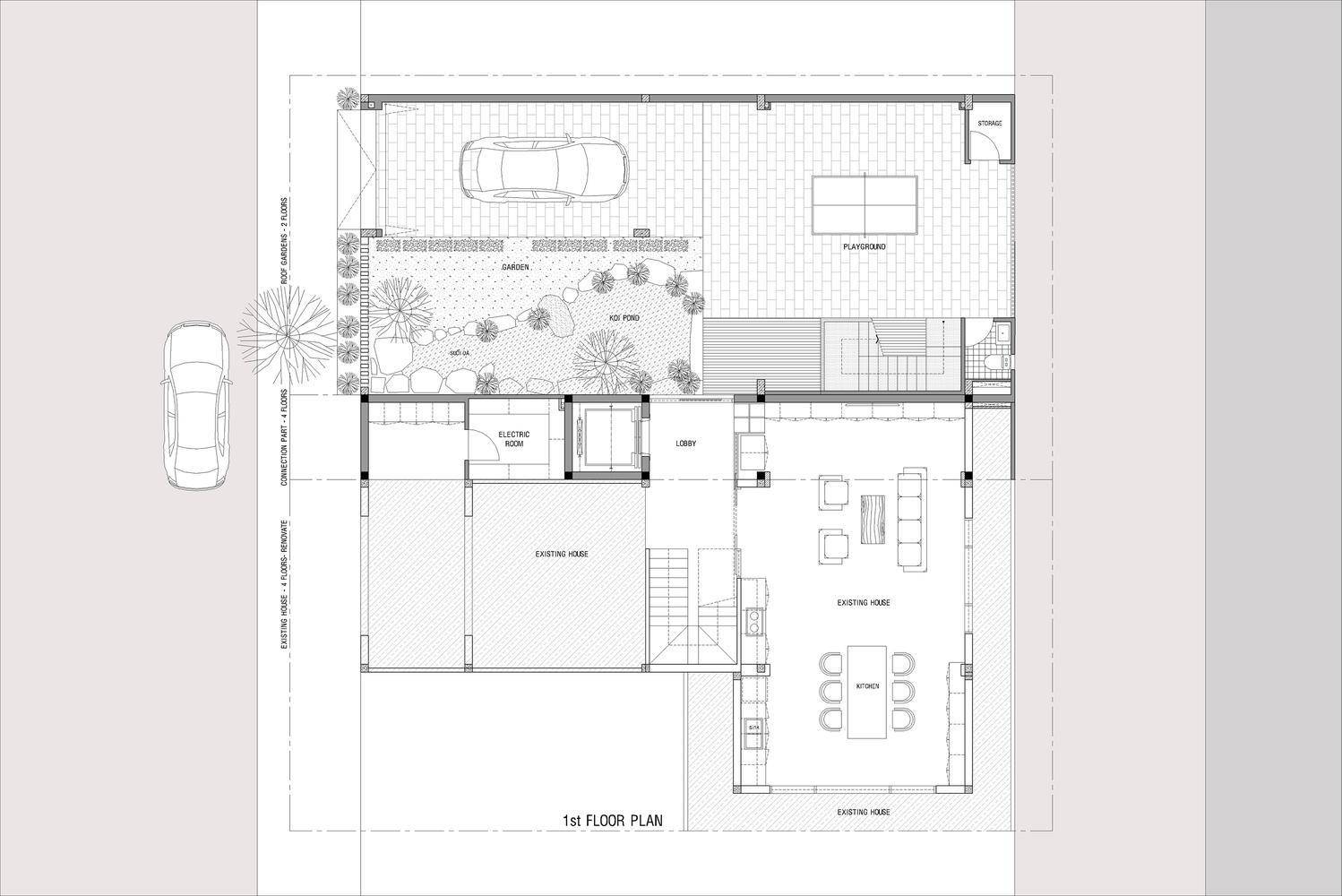 "Vườn trên mái" (trái) nằm cạnh nơi ở của một gia đình 2 thế hệ, dù được xây mới hoàn toàn nhưng nhờ giải pháp kết nối hài hòa từ kiến trúc đến cảnh quan nên công trình trở thành một phần quan trọng trong tổng thể bối cảnh và khó có thể nhận ra đâu là cũ, đâu là mới.