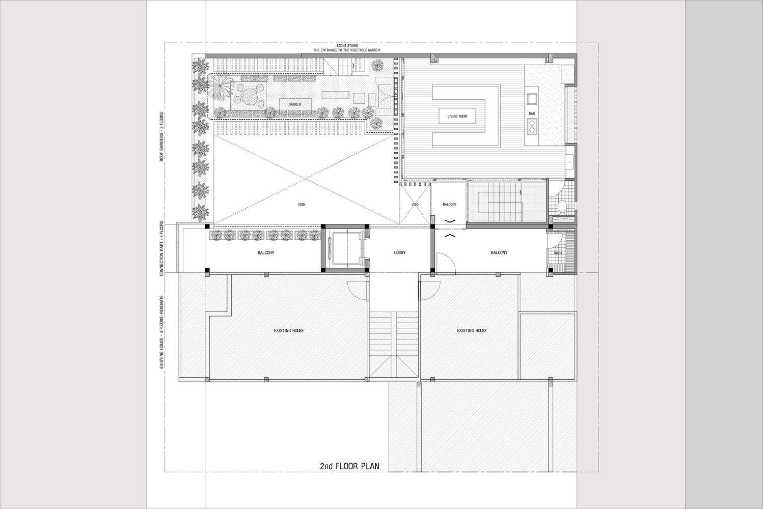 Thay vì có một khoảng sân rộng như những ngôi nhà trong làng, KTS tạo ra nhiều khoảng sân ở các độ cao khác nhau, phù hợp với kết cấu chiều cao của ngôi nhà. Trong đó gác lửng tạo một khoảng sân để thông với sân giữa của ngôi nhà.
