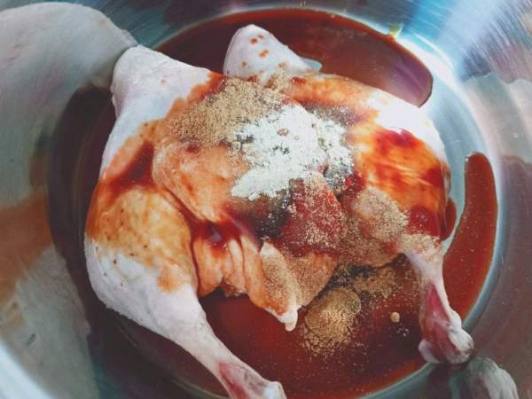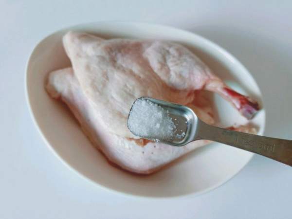 Đeo găng tay dùng một lần, xoa bóp từng phần đùi vịt, dùng màng bọc thực phẩm bọc lại và ướp trong ngăn mát tủ lạnh hơn 1 tiếng cho thấm gia vị.