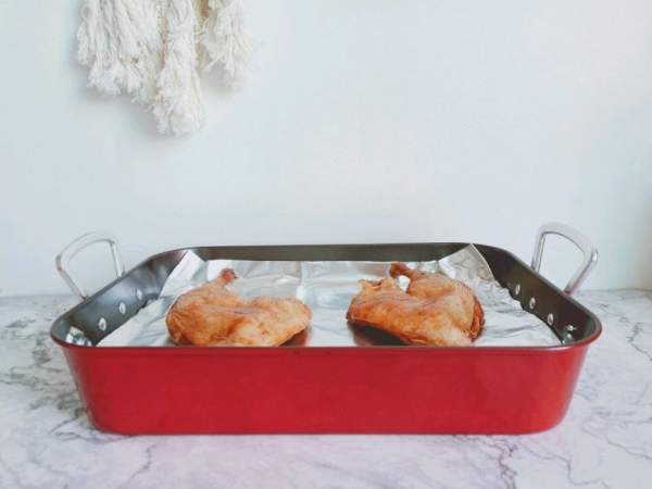 Trải một miếng giấy bạc lên khay nướng, xếp đùi vịt đã ướp lên trên. Phết một lớp dầu ăn lên mặt vịt.