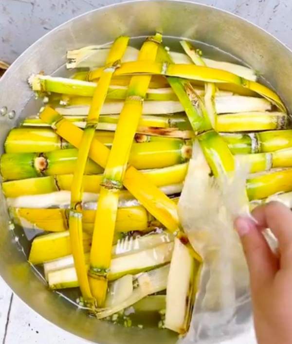 Mía sẽ được lót một lớp dưới đáy nồi, sau đó xếp cá vào giữa, lớp trên cùng là những thanh mía chẻ
