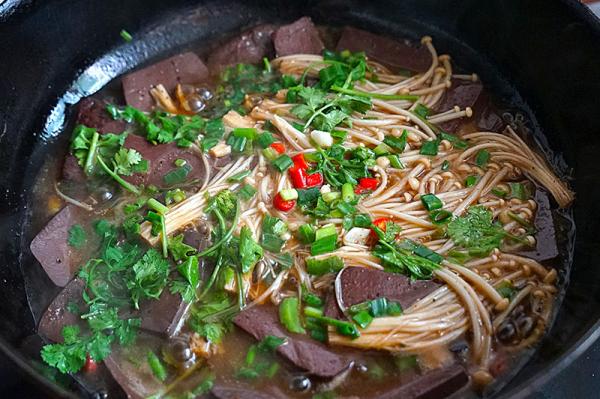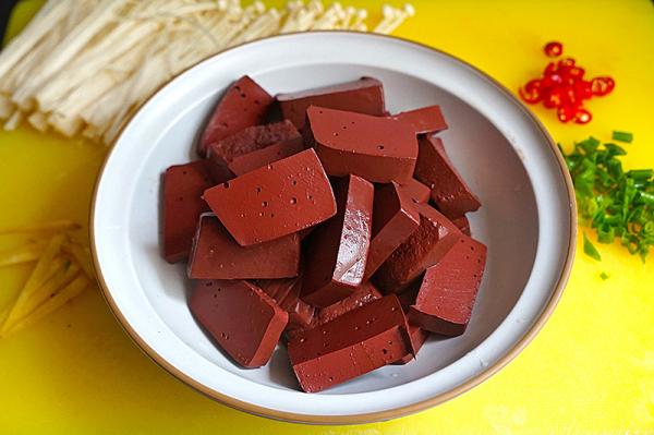 Chuẩn bị tiết heo, nấm kim châm, tiêu, tỏi và các nguyên liệu khác. Rửa sạch tiết heo và cắt thành từng miếng vuông nhỏ từ 3-4 cm. Nấm kim châm cắt bỏ rễ, sau đó chia thành từng phần nhỏ, gừng thái sợi.