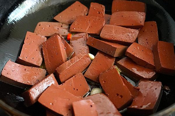 Đun nóng dầu trong chảo, cho gừng, tỏi băm nhỏ và hành lá vào phi thơm. Đổ tiết heo vào xào đều trên lửa vừa. Đổ nước tương, rượu nấu ăn và một chút đường vào xào đều, thêm nửa bát con nước sôi, đậy vung đun nhỏ lửa trong 2 phút.