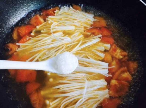 Sau đó thả nấm kim châm vào, nêm nếm muối cho vừa miệng. Nấu một lúc nấm chuyển sang màu trắng đục là nấm chín thì tắt bếp.