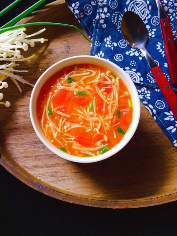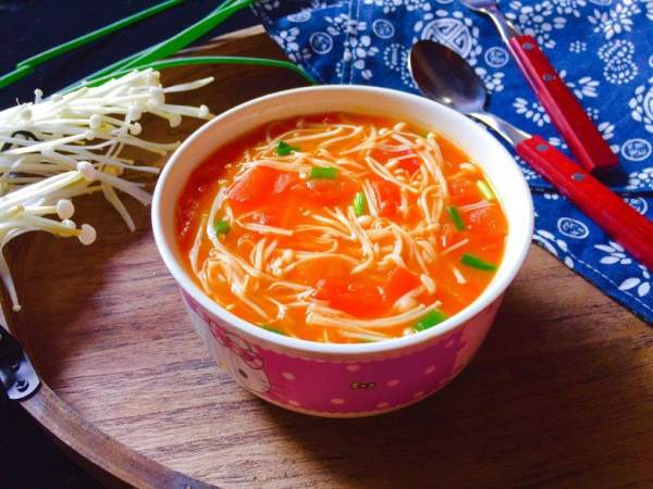 Cho canh ra bát, rắc ít hành lá lên rồi thưởng thức. Canh cà chua nấm kim châm chua chua, thanh thanh, đặc biệt dễ ăn, rất hợp bữa cơm mùa hè.