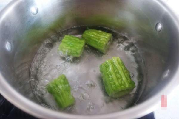 Đun sôi nước trong nồi, cho mướp đắng vào chần sơ qua, cho một ít muối và dầu thực vật vào. Muối và dầu ăn giúp mướp có màu xanh đẹp mắt. Hơn nữa việc chần mướp như vậy cũng giúp nó bớt đắng hơn.