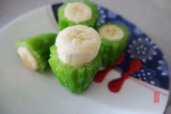 Cắt chuối thành nhiều đoạn theo chiều dài của các đoạn mướp đắng rồi từ từ nhồi chuối vào trái mướp đắng như trong hình.