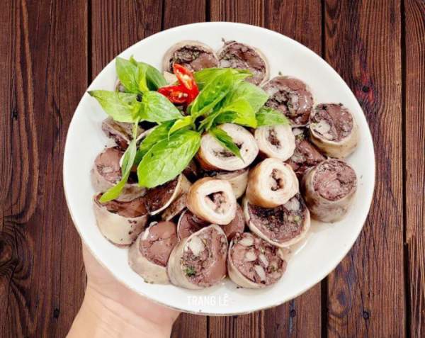 Trộn nhân: Mỡ khổ luộc sơ qua, băm nhỏ. Hành - răm - ngổ thái thật nhỏ. Mì chính - hạt nêm (1 chút thôi) trộn đều với mỡ và hành răm. Cho tiết vào hỗn hợp. Cho thêm nước lã (tỉ lệ tiết 3 nước 2). Trộn đều đợi cho tiết đông lại thì nhồi. Không chặt tay quá tránh lúc luộc bị bục.