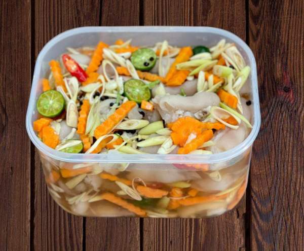 - Xếp móng giò và hỗn hợp đi kèm vào lọ thuỷ tinh hoặc hộp có nắp, đổ nước ngâm vào ngập móng, đậy nắp cho ngăn mát 1-2 hôm là ăn được.