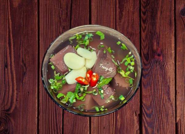Đun sôi 1 nồi nước cho thêm 1 thìa cà phê bột canh hoặc hạt nêm. Nhẹ nhàng cho tiết đã đông vào luộc. Khi bắt đầu tiết sôi thì hạ lửa nhanh không sẽ trào ra. Luộc tiết tầm 10 phút xắn đôi thử 1 miếng nếu không còn thấy đỏ là đã chín. Múc ra bát lại rắc thêm chút hành ngổ và đầu hành chần lên rồi thưởng thức.