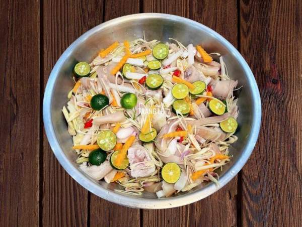 - Thái tai mũi theo chiều dài nhất có thể. Độ dày vừa phải. Trộn nước mắm gia vị vừa đủ cho ngấm