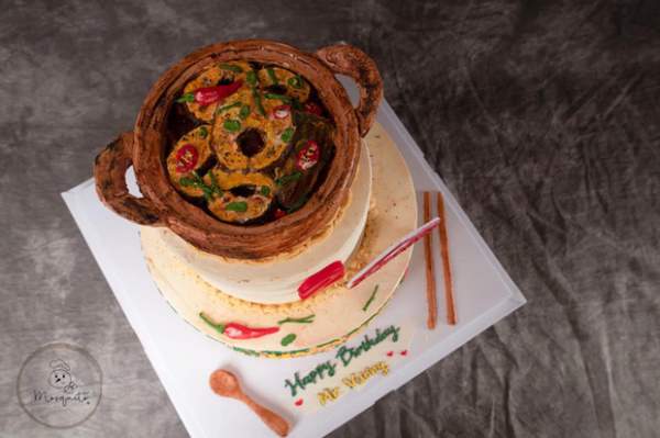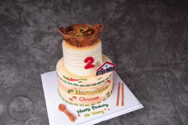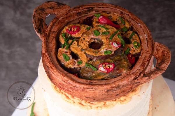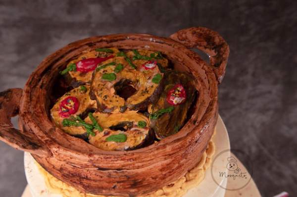 Chiếc bánh gato này gồm có 3 tầng, 2 tầng dưới cùng là bánh gato như bình thường còn tầng trên cùng được tạo hình niêu cá kho. Điều đặc biệt là phần niêu cá được tạo hình rất chi tiết và giống thật, từ vẻ ngoài của chiếc niêu đất cho đến miếng cá kho bên trong hay miếng ớt, hành lá, hạt tiêu... Để ý kỹ còn thấy phần kem dưới đáy niêu được tạo hình giống như chiếc lót nồi bằng cói vậy.