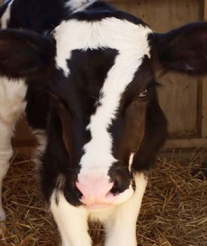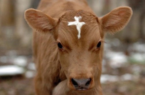 Chú bò nhỏ nổi bật nhờ đốm lông hình cây thánh giá trên trán.