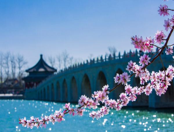 Bắc Kinh luôn tự hào vì có nhiều công viên và địa điểm tham quan cấp quốc gia. Vào mùa xuân đây là địa điểm tuyệt đẹp để thưởng ngoạn những sắc hoa bừng nở. Trong ảnh là một nhánh hoa đào khoe sắc ở gần cây cầu 17 nhịp tại Cung điện mùa hè.