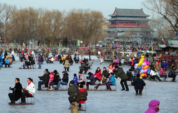 Không chỉ ở châu Â, châu Á cũng có những mặt hồ đóng băng tự nhiên đẹp mắt. Trong ảnh là cảnh hàng trăm du khách vui chơi trên mặt hồ Shichahai ở Bắc Kinh (Trung Quốc).