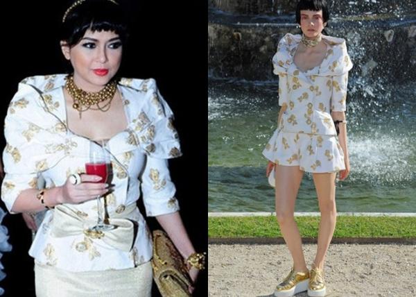 Cựu diễn viên Thủy Tiên trước đây thường bị chê phối phụ kiện hàng hiệu rườm rà. Thiết kế của nằm trong bộ sưu tập Resort 2013 của Chanel (phải) sẽ đẹp hơn nếu Thủy Tiên không lạm dụng trang sức.
