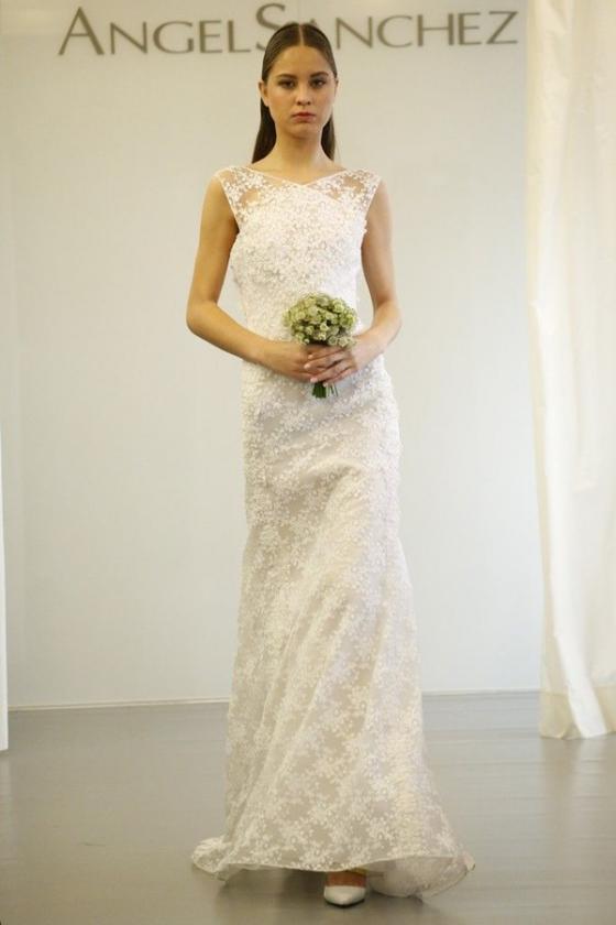 Angel Sanchez Mikado thể hiện kĩ thuật xử lý ren tuyệt vời khi kết hợp chất liệu ren với những viên pha lê, ngọc trai lấp lánh đi cùng thiết kế váy cuốn băng ở phần ngực và thân váy xòe bồng bềnh vô cùng lãng mạn.
