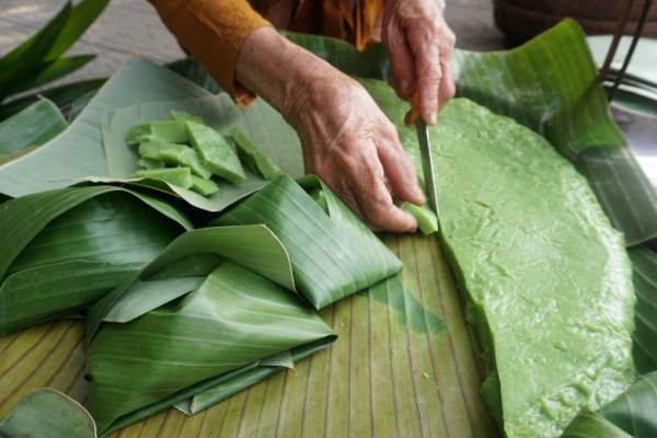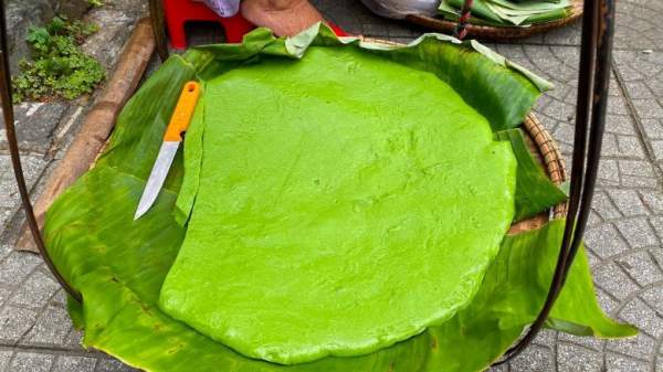Bánh màu xanh được cắt từng miếng vừa ăn rất khéo, được gói lại trong miếng lá chuối tươi, Người Huế khi ăn món bánh này không dùng thìa hoặc đũa như các loại bánh thông thường mà dùng dao tre để quết mật lên bánh, một kiểu cách Cố đô. Đây cũng là một trong những thức quà của tuổi thơ biết bao thế hệ người dân xứ Huế.