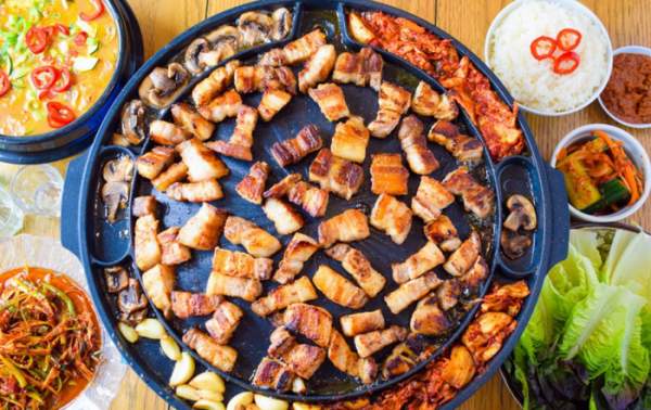 Samgyeopsal là một món ăn nổi tiếng khác của Hàn Quốc đòi hỏi ít kỹ năng nấu nướng. Những lát thịt lợn thái mỏng được nướng tại bàn. Sau đó, nó được gói trong rau diếp hoặc lá vừng với nước chấm và các món ăn kèm như nấm, ớt xanh, hành lá, hành sống và tỏi, cũng như kim chi.