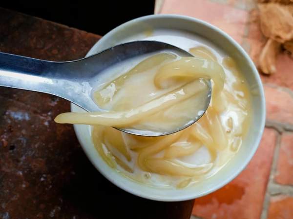Bánh canh ngọt còn gọi là chè bánh canh là món ăn dân dã, gắn liền với tuổi thơ của nhiều người miền Tây. Món ăn gồm sợi bánh canh bột xắt, nước cốt dừa, đường thốt nốt nấu cùng nhau. Cách kết hợp hài hòa làm nên món ăn béo, ngọt thanh, phảng phất hương thơm nhẹ của đường thốt nốt, có thể thêm chút mè rang vàng. Bánh canh ngọt thường được dùng như món tráng miệng hoặc lót dạ khi đói. Ảnh: Lê Hữu Tường