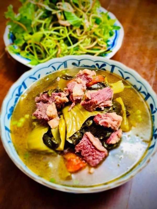 Ngoài nấu với cá, dưa chua có thể nấu với thịt bò, cách làm cũng không có gì phức tạp. Thịt bò nấu canh dưa là loại dẻ sườn hoặc gân, nói chung là ít thịt nhiều gân thì mới giòn, mềm và không bị khô. Thịt dẻ sườn hay gân bò trước khi nấu cũng cần làm sạch bằng chần qua nước sôi cho sạch tiết và xào sơ. Canh dưa nấu gân bò, dẻ sườn bò nếu ăn vào những ngày mưa phùn lạnh lẽo thì vô cùng thích hợp.