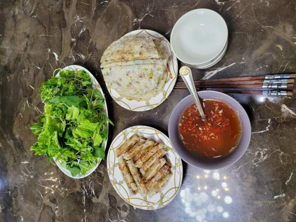 Bánh xèo Quảng Ngãi thường được ăn kèm với ram bắp và rau sống, chén nước mắm pha mặn