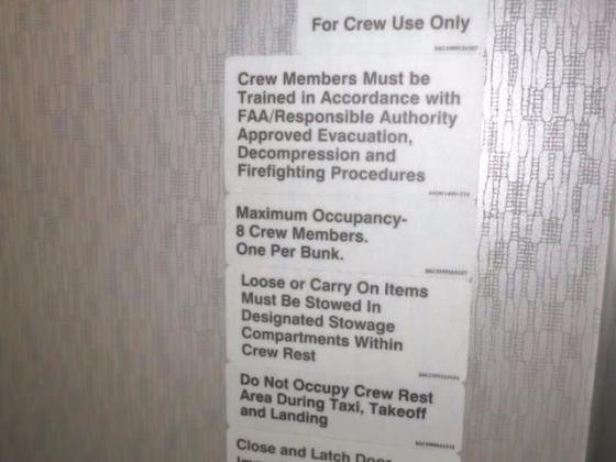 Một chỉ dẫn tiết lộ phía sau cánh cửa có gì, tám chiếc giường chỉ dành cho phi hành đoàn. Bạn sẽ chẳng bao giờ thấy nó nếu chỉ là một hành khách.