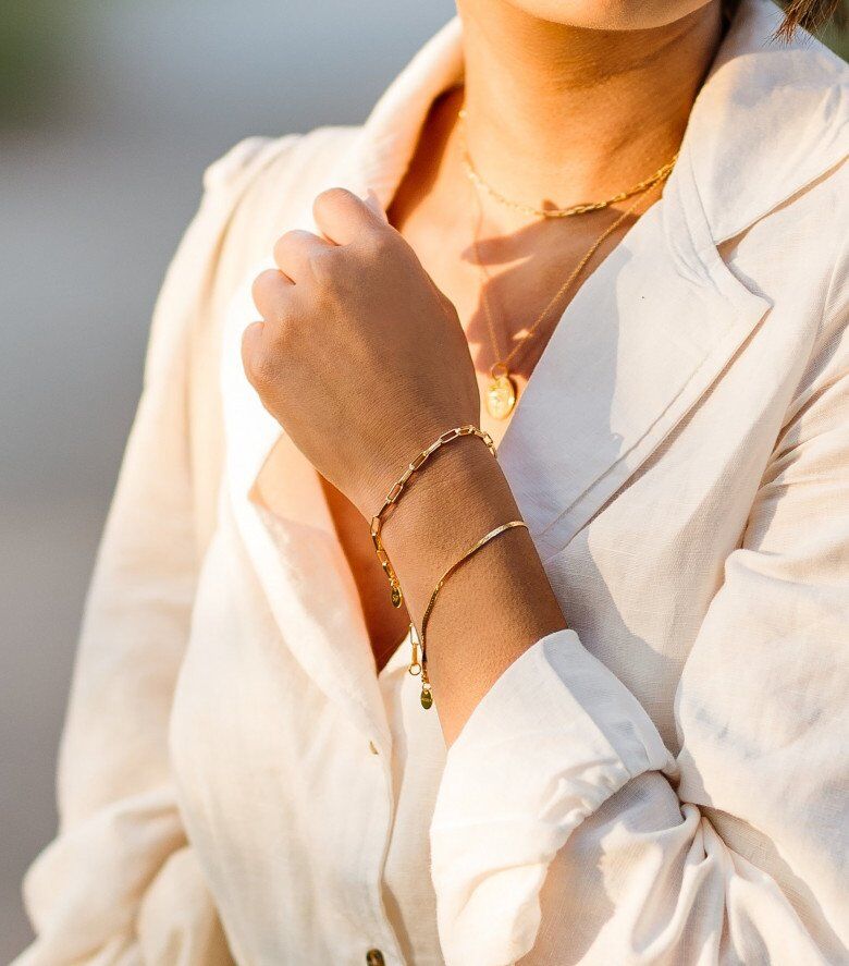 Chị em có thể đeo 2 chiếc vòng đơn giản, mảnh trên cùng một tay nếu muốn thêm phần cá tính.