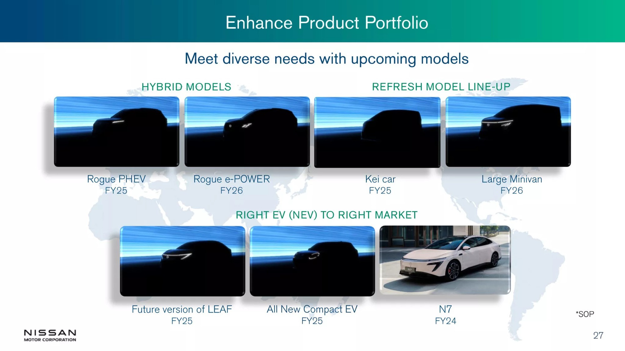 Tiếp đến, một mẫu hatchback cỡ nhỏ dành cho châu Âu cũng sẽ ra mắt trong cùng giai đoạn. Tại Nhật một năm sau đó, hãng sẽ ra mắt một dòng xe kei và một dòng MPV cỡ lớn. Cuối cùng, sedan điện Nissan N7 đã ra mắt tại Trung Quốc là mẫu xe cuối cùng trong ảnh thuyết trình của hãng.
