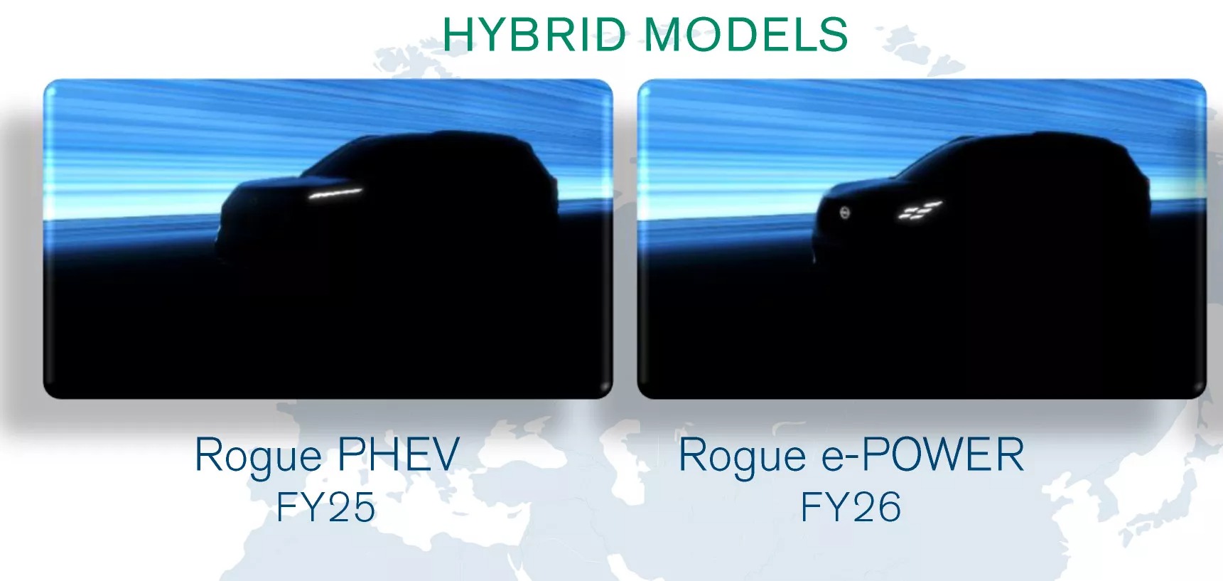 Đầu tiên, trong năm 2025, Nissan X-Trail (còn có tên Rogue tại một số thị trường) sẽ có phiên bản hybrid sạc điện PHEV. Một bản hybrid thường (e-Power) sẽ ra mắt chậm hơn vào 2026. Tuy nhiên, yếu tố đáng ngạc nhiên là vóc dáng và giao diện đèn 2 bản này trong ảnh thuyết trình của Nissan khác hẳn nhau.