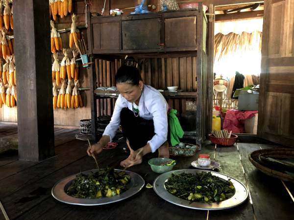 Các bà, các mẹ người dân tộc Mường đang chuẩn bị mâm cỗ lá. Ảnh: Dulichphutho.