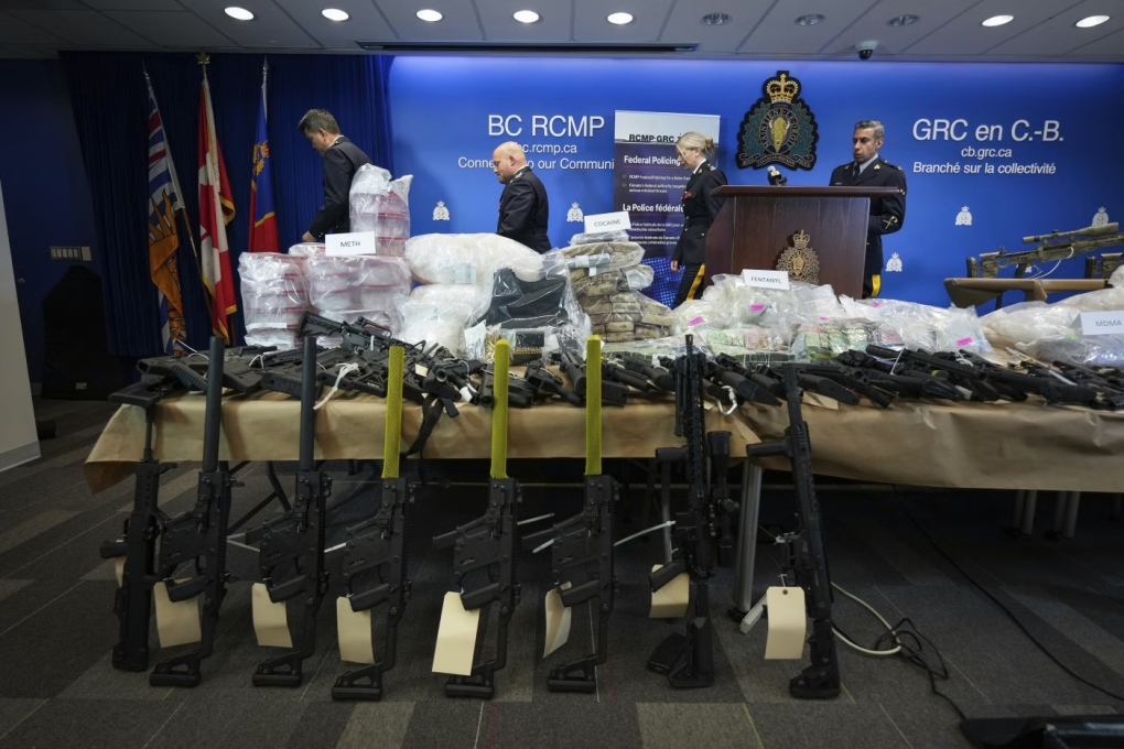 Vũ khí và thuốc gây nghiện bị thu giữ trong cuộc đột kích siêu phòng điều chế ở British Columbia hồi tháng 10/2024. Ảnh: AP