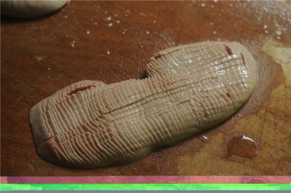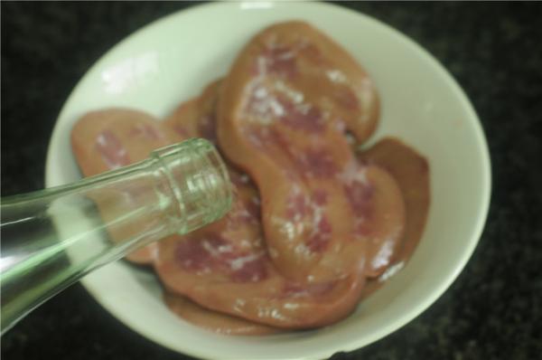 Loại bỏ các đường gân trắng bên trong miếng cật lợn, đổ giấm vào chà kỹ, sau đó rửa lại bằng nước.