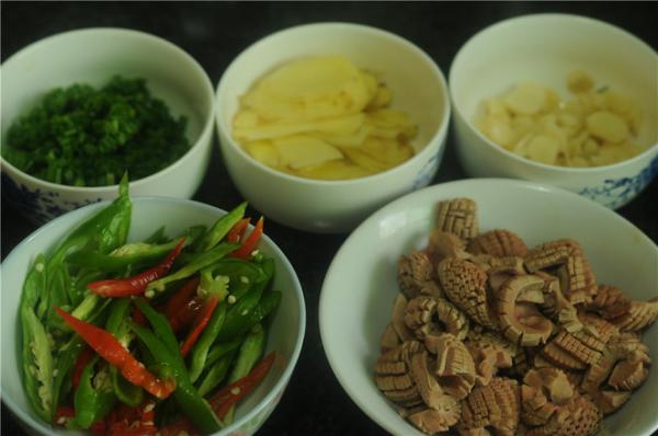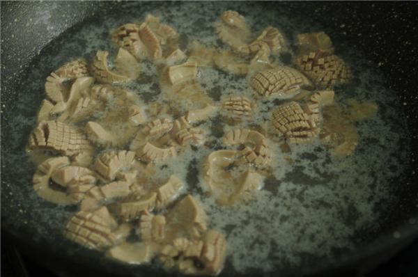 Cho dầu vào nồi đun nóng, khi thấy khói dầu nhẹ thì cho hành lá, gừng, tỏi băm nhỏ vào xào. Sau đó cho cật lợn đã chần vào khoảng nửa phút trên lửa lớn, đổ rượu nấu ăn dọc theo thành nồi, nấu trên lửa lớn để khử bớt mùi tanh.